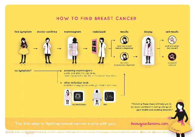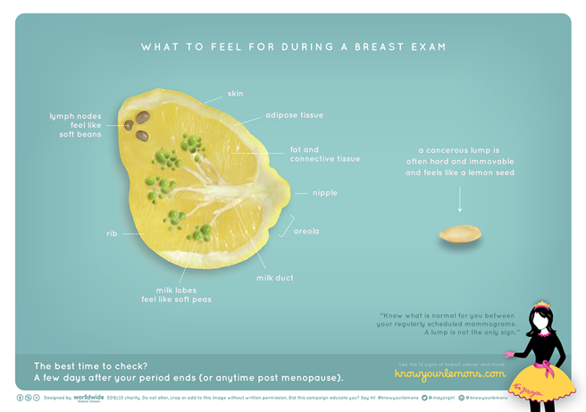 A través de diferentes inforgrafías en las que se representan los pechos femeninos con limones y bajo el hashtag #knowyourlemons, la campaña señala todos los pasos necesarios que deben seguir las mujeres en caso de notar cambios en sus pechos: desde la revisión en casa hasta los pasos a seguir con un médico.