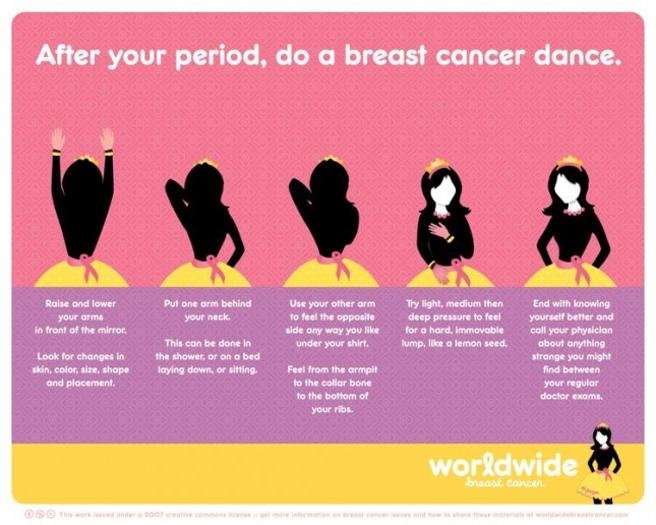 En caso de notar alguno de estos cambios en el pecho, la campaña insiste: “Si permanecen, acude al médico”. Además, se explica cómo las mujeres deben examinarse en casa para encontrar estos síntomas: “Después del periodo, haz la danza del cáncer de mama”.